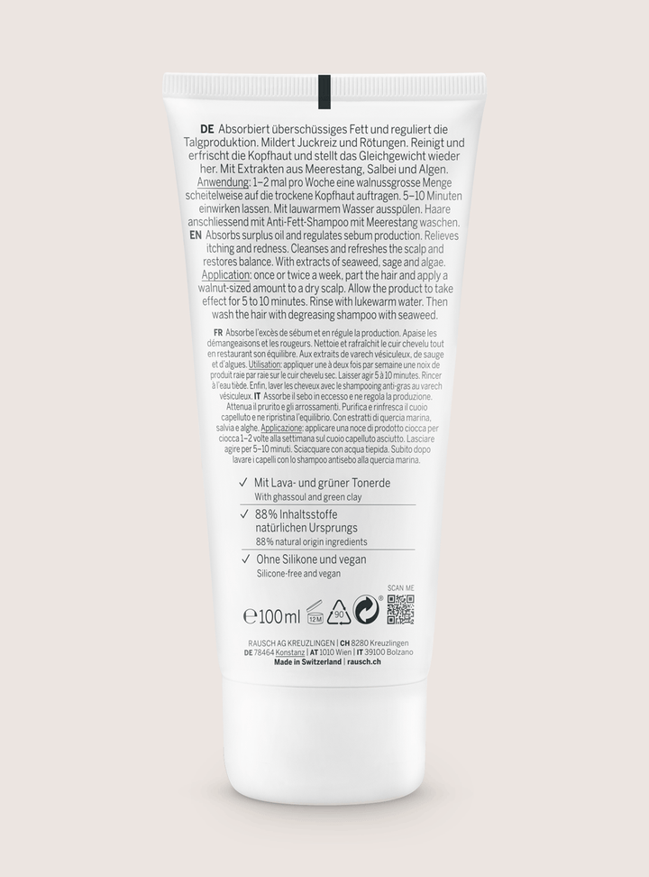 Treatment for greasy hair and scalp. Absorbs excess oil, regulates sebum production and alleviates unpleasant itchiness and redness. Ideal as a pre-treatment before washing the hair, it considerably reduces oil on the scalp and hair. The scalp feels refreshed and its natural balance is restored. Thanks to the treatment’s unique formula it inhibits greasy build-up and makes frequent shampooing unnecessary. With lava and green clay, colloidal silt and precious extracts of seaweed, sage and algae.