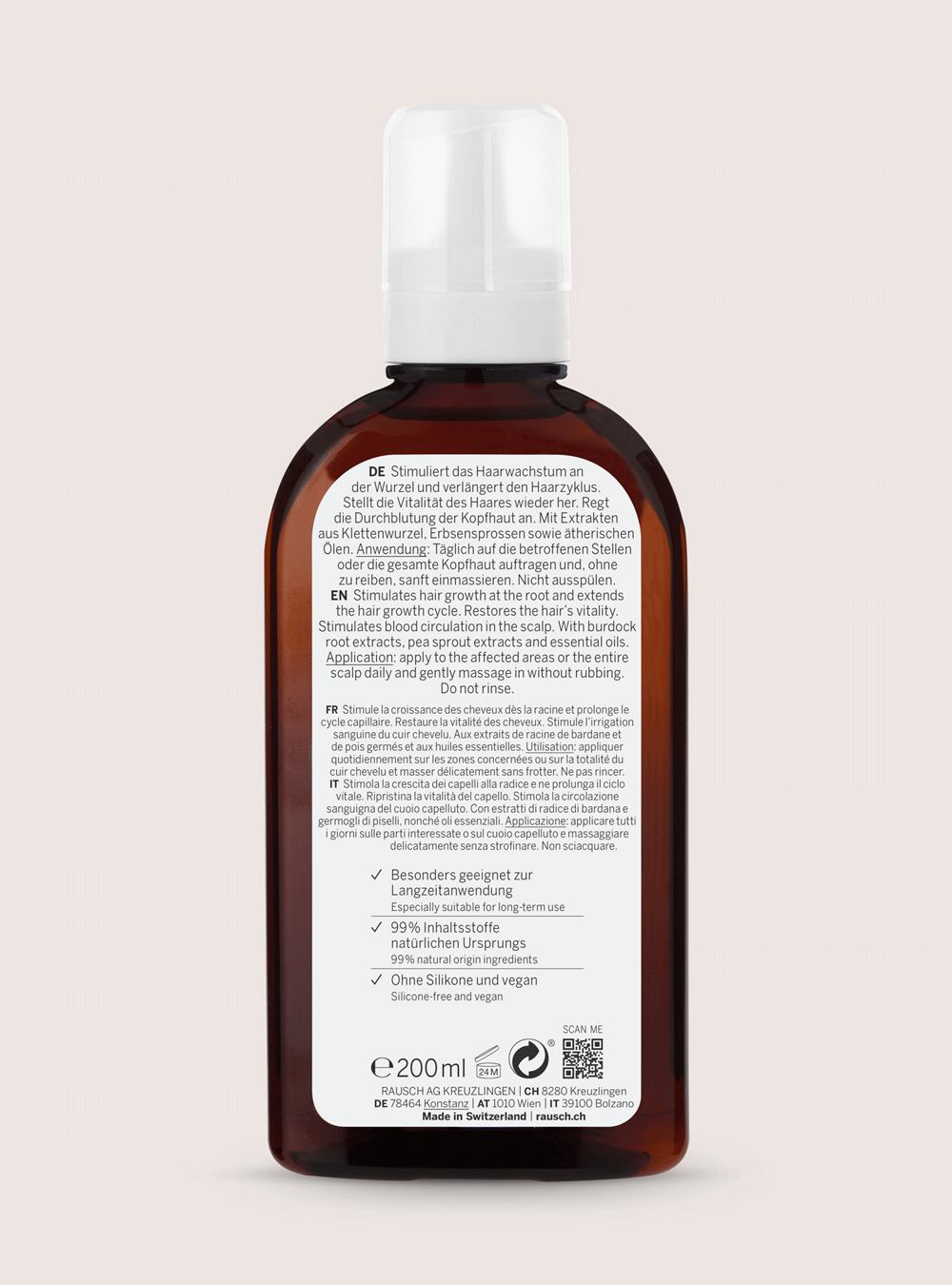Tincture to counteract hair loss. Combats hair loss and stimulates hair growth right from the root. The special tincture stimulates blood circulation and regulates key functions in the scalp. In this way, the hair growth cycle is extended and the hair shines with vitality so it looks fuller after just three months. Especially suitable for long-term use. With essential oils and precious extracts of burdock root and pea sprout.